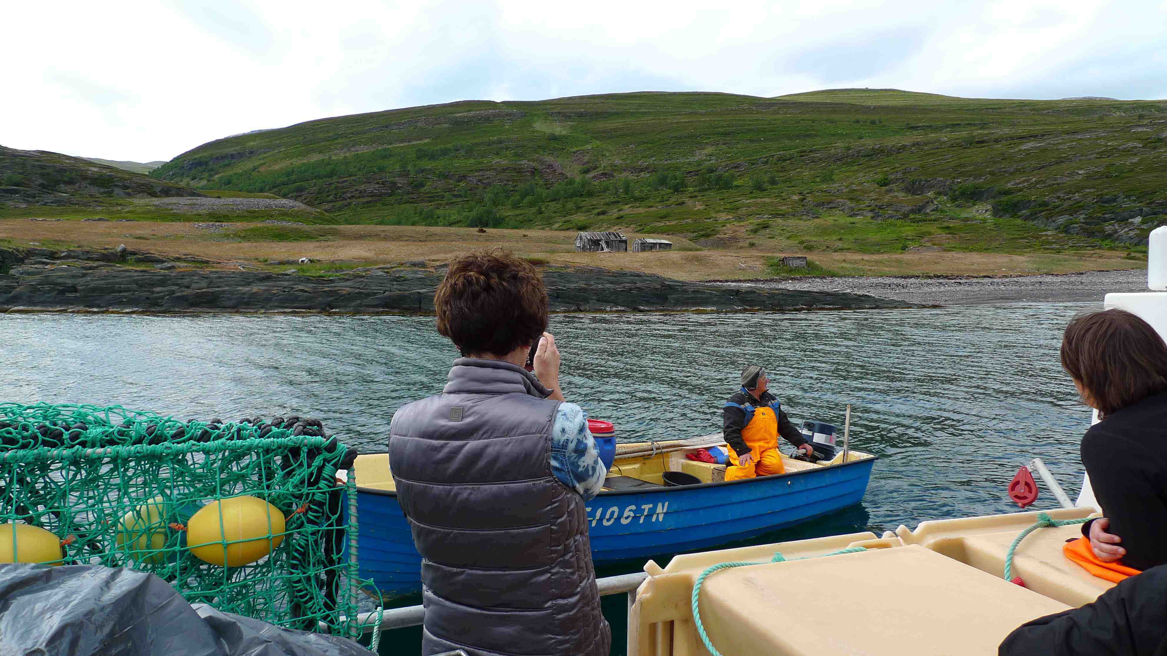 Ferden fra Lakselv gikk videre til Sjursjokk, hvor våre lokale fiskere Trygve og Joakim møtte oss med båt. Full lastet til randen med utgravningsutstyr, telt og mat seilte vi nordover i Tanafjorden mot Digermulen. Joakim krabbefiskeren, dro opp en tegne og tok ut en gedigen kongekrabbe som han kokte og serverte oss underveis.