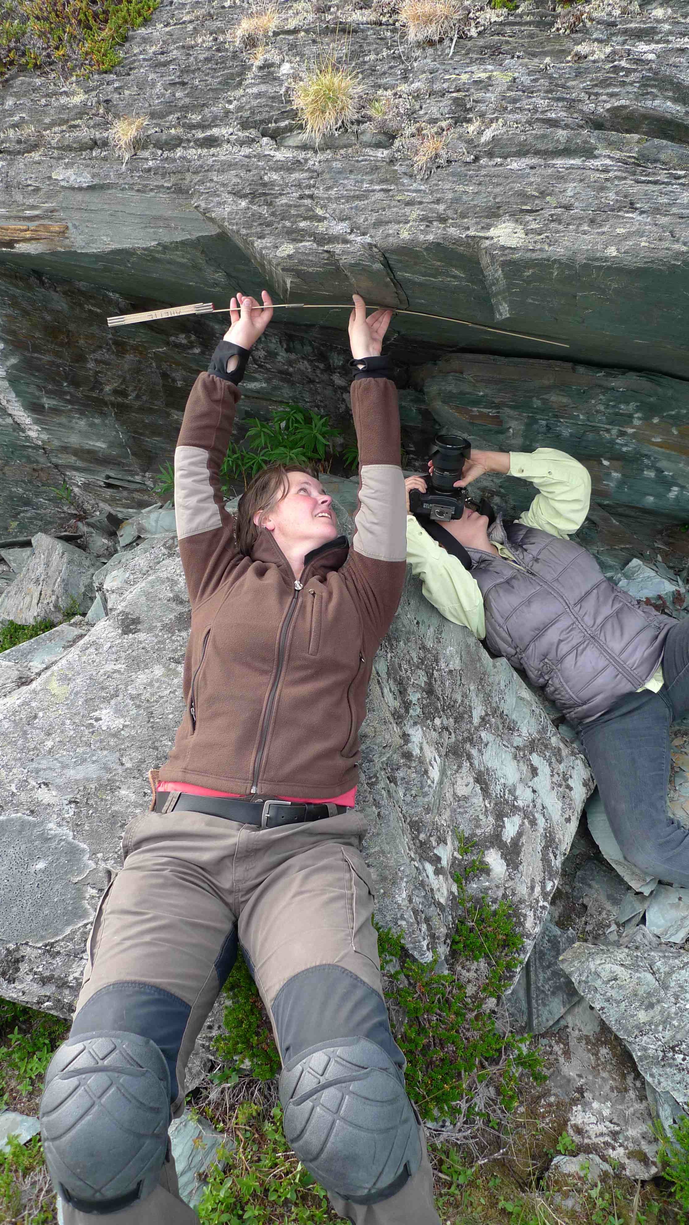 Fotografering av disse runde disker kan vare utfordrende, å fota de som sitter på underside av ei klippe enda mer. Vi kryper inn og Wendy tar bilder av alle fossil og jeg prøver og holde tommestokken still.