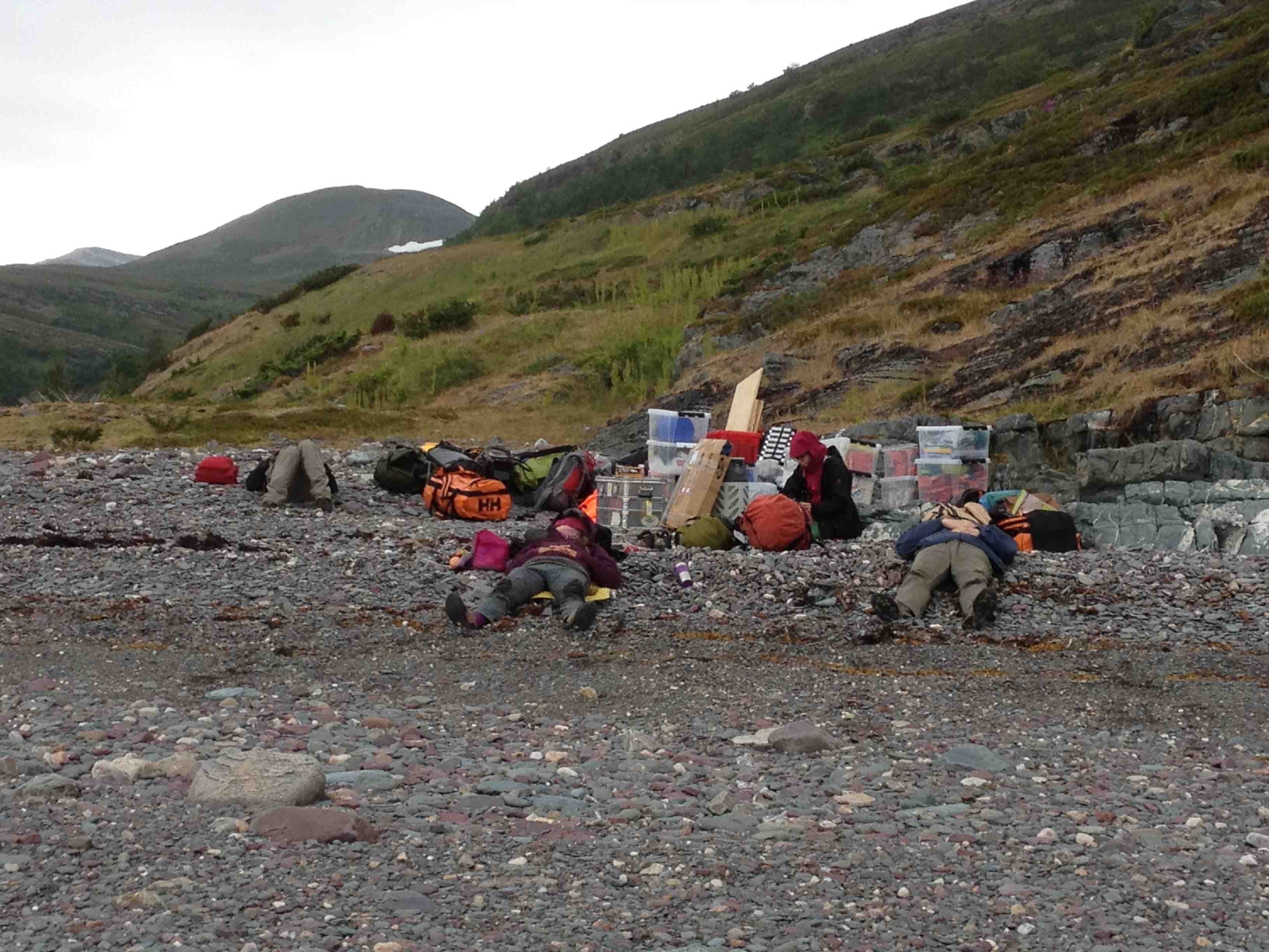 Fig 4. Awaiting pick up on the Precambrian pebble beach at Manndrapselva.