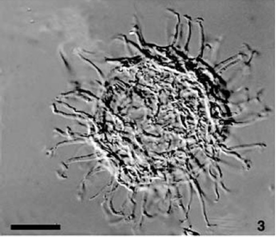 Figure 5: Process-bearing Cambrian acritarch Skiagia ornata, extracted from shales (from: Moczydłowska, 2011). Scale bar: 15 µm.