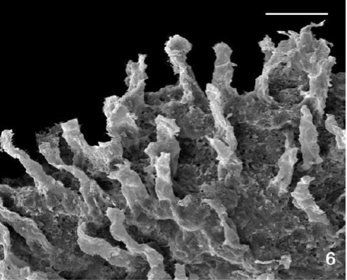 Figure 6: (Above & below images.) Size and shape of the spines surrounding the microfossil vesicles called processes (left, Ericiasphaera) and patterns on the acritarchs’ organic walls (right, Dictyosphaera macroreticulata) are helpful for distinguishing between different species. (from: Willman & Moczydłowska, 2006; Agić et al., 2014). Images obtained by SEM.micro 6b