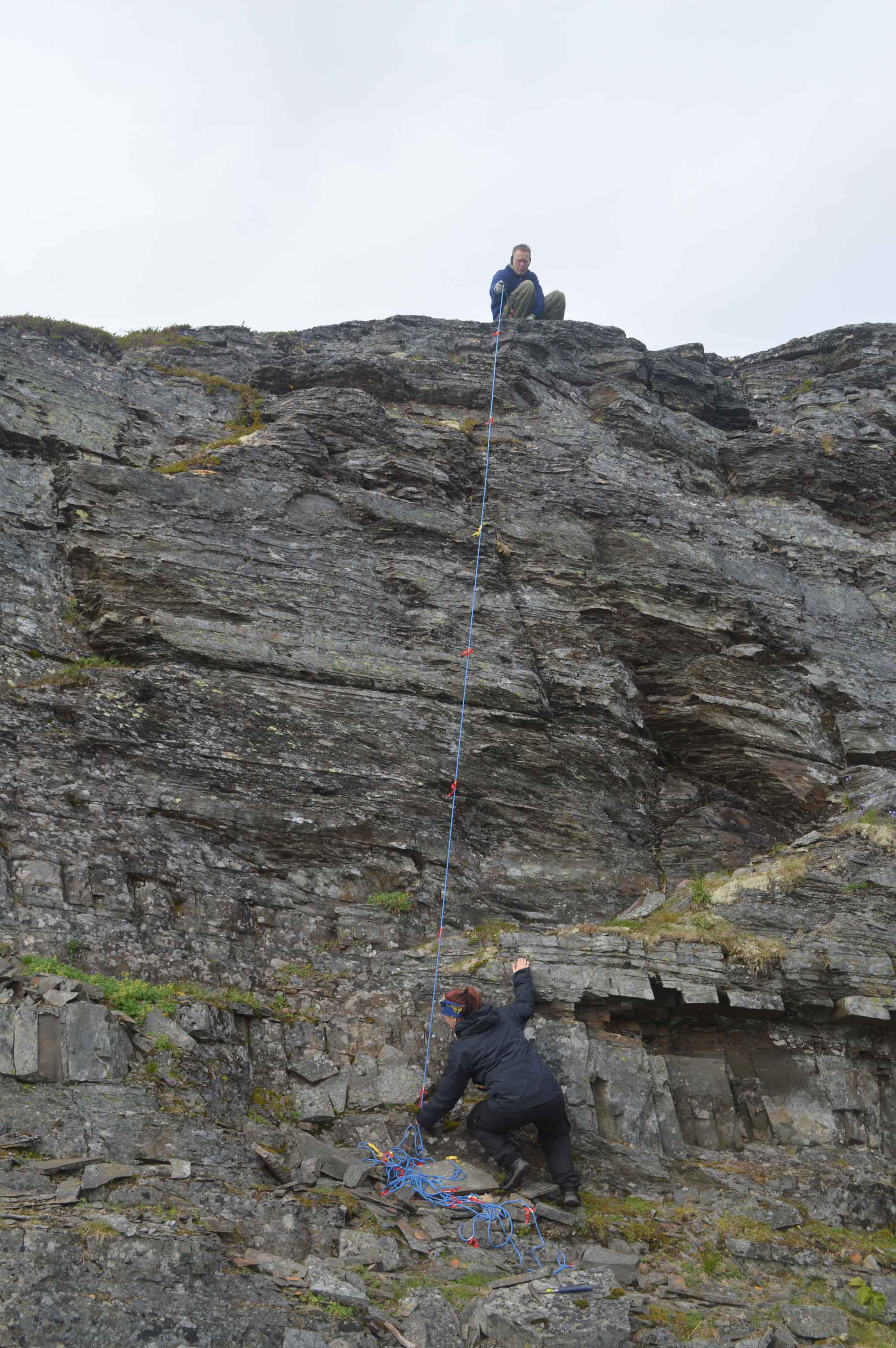 A typical day on Digermulen starts with a cheerful breakfast in our kitchen tent — bacon, fried eggs, porridge and müsli, usually accompanied by tea, coffee or hot chocolate depending on what we feel like. Such high-calorie food guarantees enough energy for a sturdy hike in the morning and a long workday. After breakfast, researchers will discuss the day’s destinations; bad weather can have a large impact on planned work. We then grab something for our individual packs as lunch — including bread, dry tech, cup noodles, fruits, norwegian sausages, hot water and any leftovers from breakfast. We do this because the field localities are not always near our campsite, we do not want to spend lots of time hiking back for lunch.