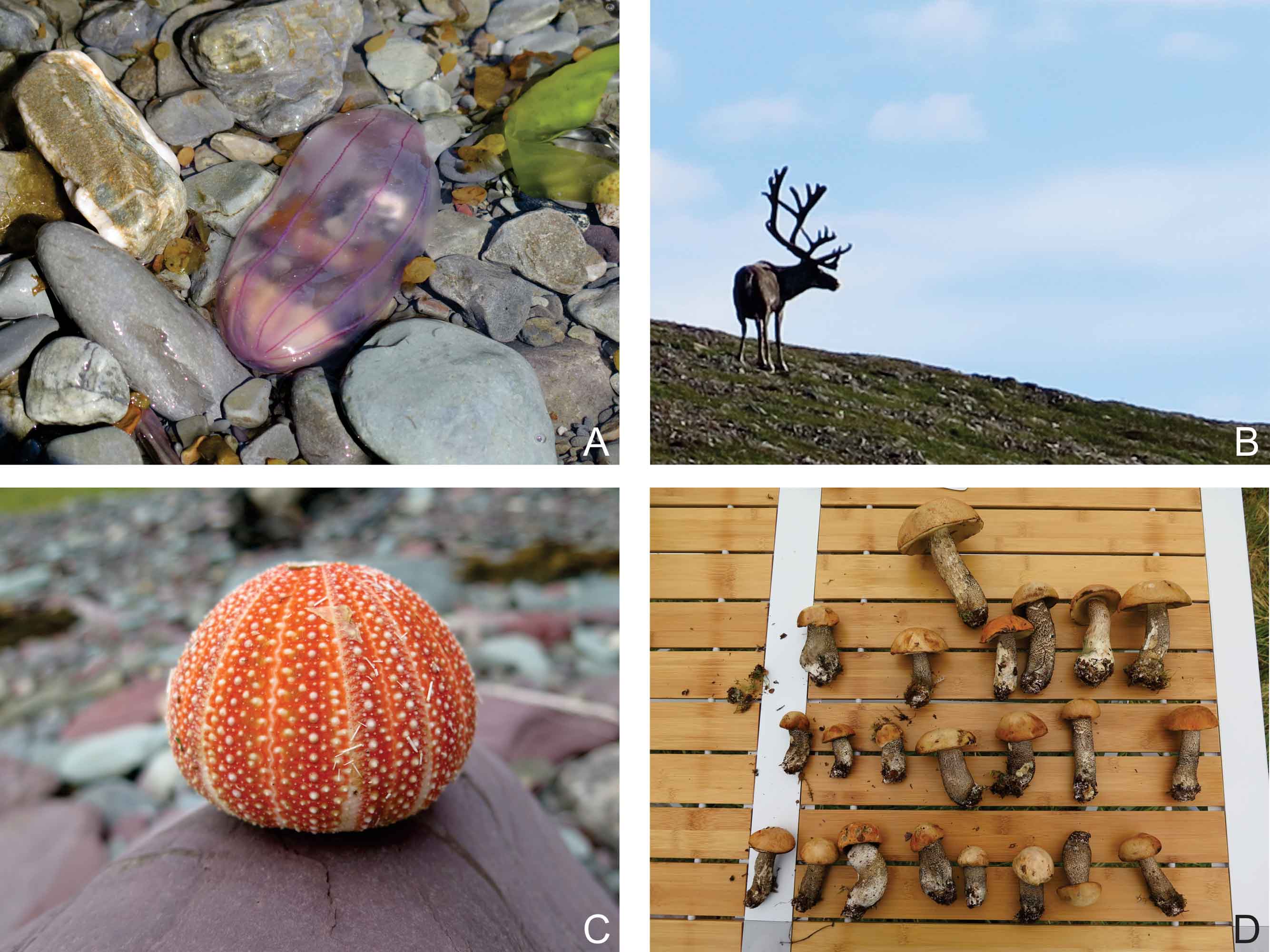 Figure 1. Organisms living on Digermulen besides visiting paleontologists. A: a stranded comb jelly awaiting photography. B: a lonely reindeer await his true love. C: a vivid sea urchin. D: edible mushrooms picked by Wendy.