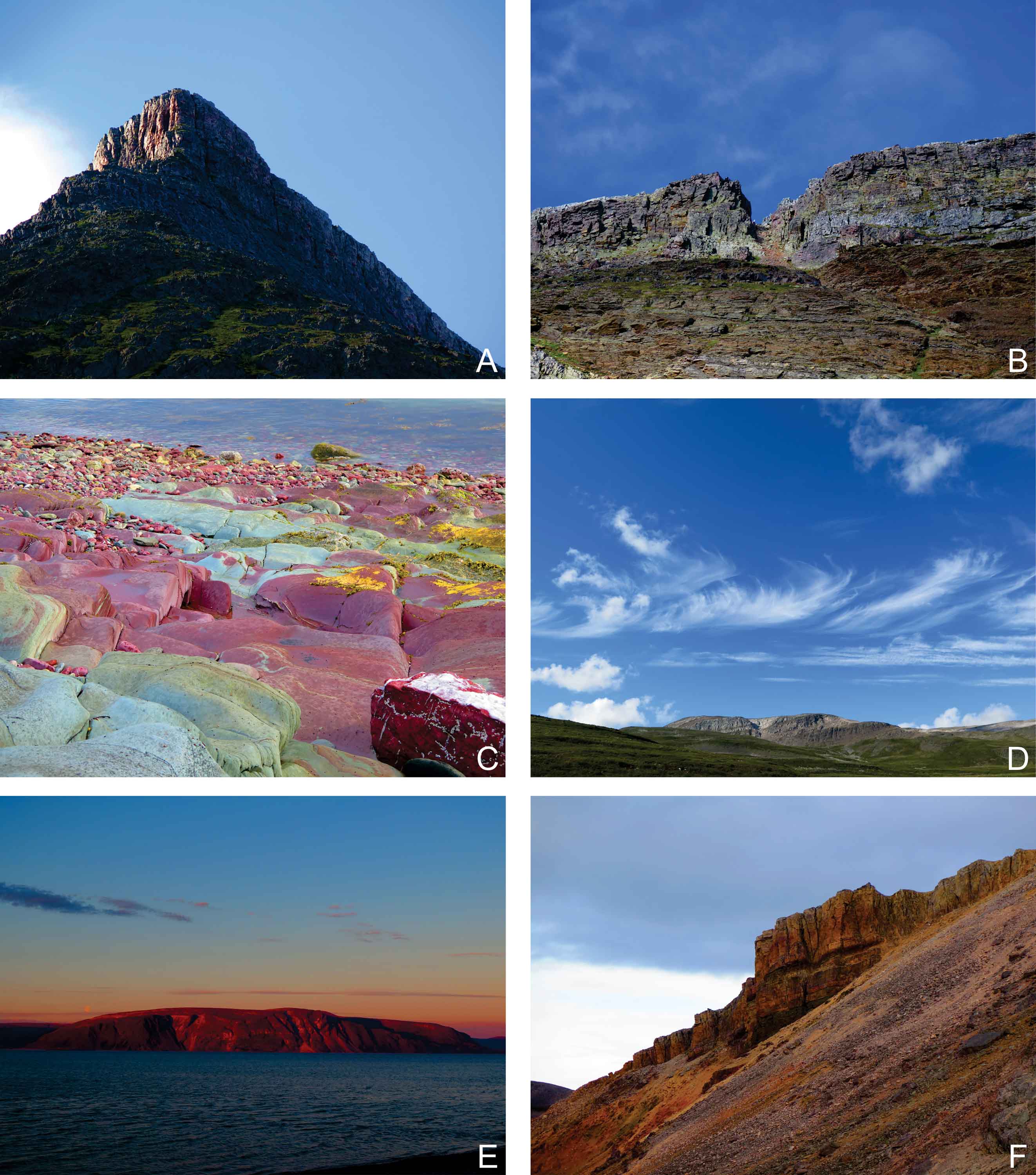 Figure 2. Splendid scenery on the Digermulen Peninsula. A: a quartzite castle of the Great Digermulen Empire. B: a reindeer trail leads you to heaven. C: multicolored beach made by colorful sandstones. D: a sunny day for fossil hunting. E: view over to the Varanger side. F: trilobite hunting ground.