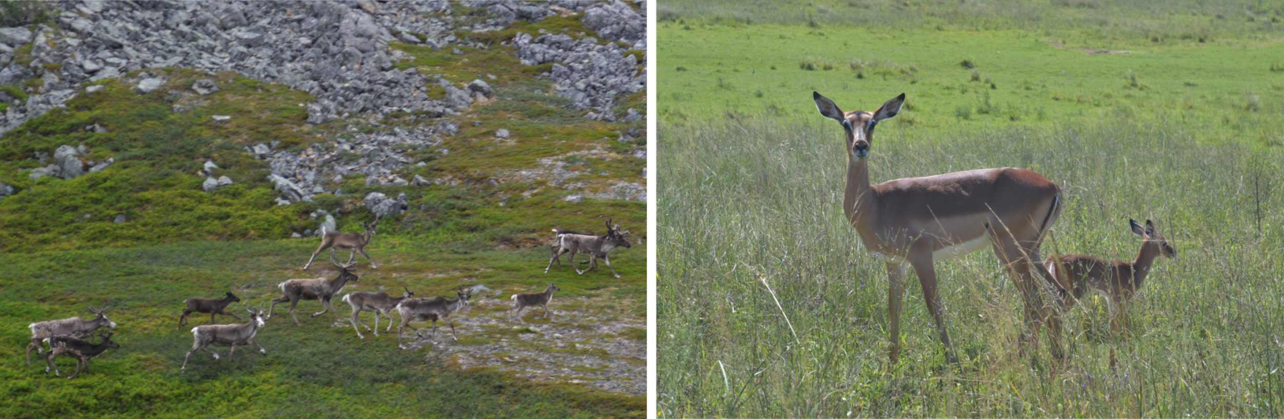 Figure 2. A herd of reindeer running through the hills (photo Bianca Harrison) compared to the smaller antelope of southern Africa (photo Wikimedia).