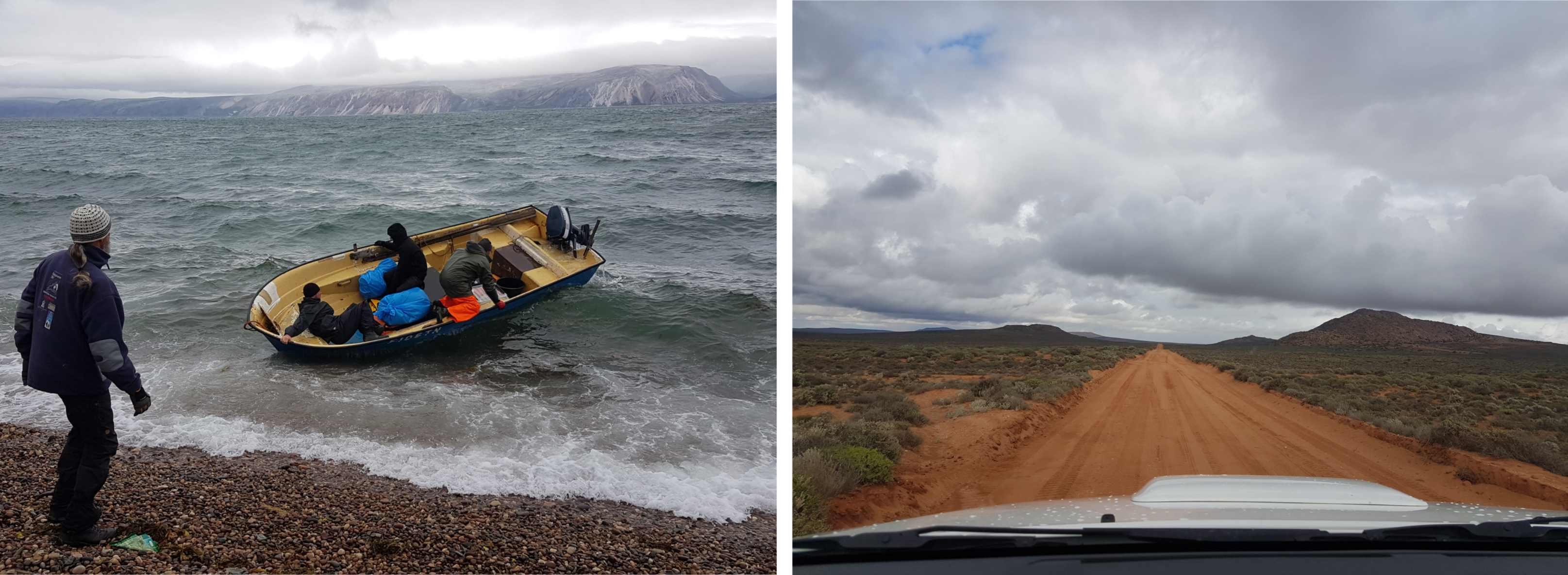 Figure 3. The Norwegian team being buffeted by waves whilst trying to leave shore compared to the dirt roads typical of fieldwork in South Africa. Photos: Bianca Harrison