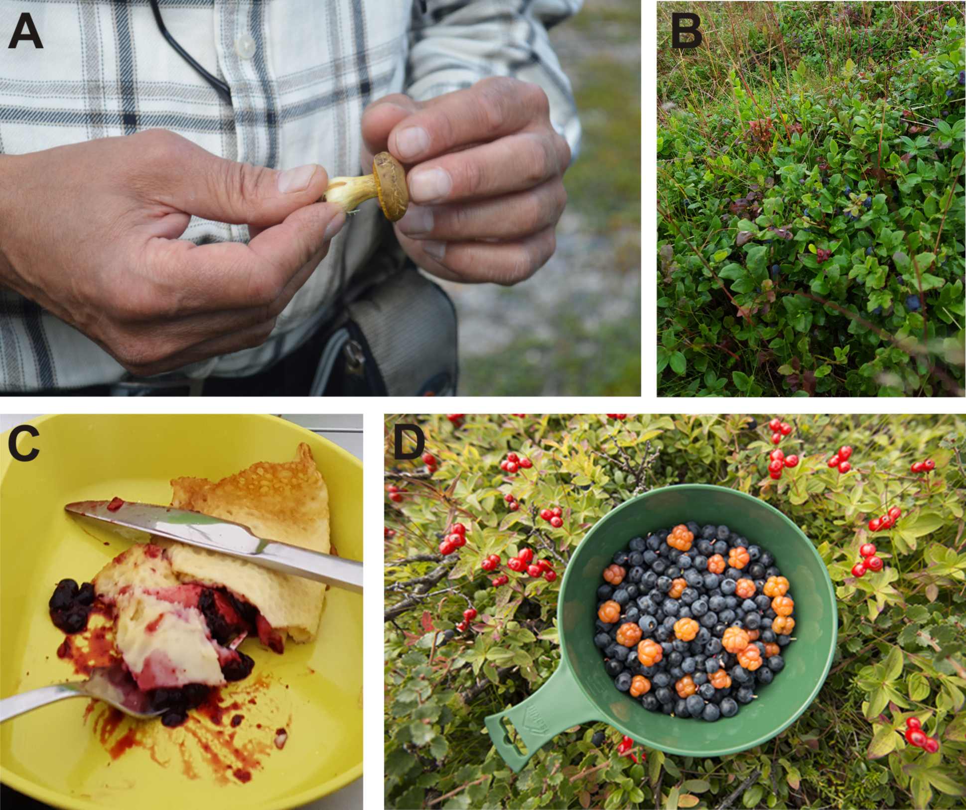 Figure 4. A – A mushroom collected in the field for dinner (Photo: Bianca Harrison). B – Patch of wild blueberries (Photo: Heda Agić). C – Crushed blueberries used as a pancake filling (Photo: Heda Agić). D – Blueberries and cloudberries growing in abundance (Photo: Wendy L. Taylor).