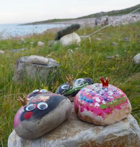 Mens de 8 store går innover fjellet hver dag og leter etter fossiler så finner de minste spennende steiner og lager små kunstverk på stranda.