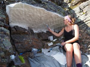 On Digermulen we find an amazing array of trace fossils produced by trilobites and organisms, giving us a unique window into animal life in the early Cambrian. The best examples we will stuff down into our backpacks and bring back to Tromsø University Museum. But, some of these traces are nearly impossible to bring back (typically the largest and best ones); the only way to break them from the rock is through days of had work with hammers, crowbars and raw palaeontological muscle power. Even then, when the traces are loose, transporting them down from the top of the valley to our camp by the beach is no simple feat. That´s when other techniques come in handy.