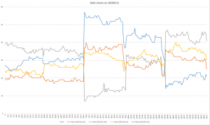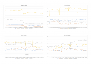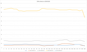 The current settings certainly don’t guarantee an equal number of clients on all APs, as illustrated in the graph below, but there’s a sense of symmetry around the 30-client line. The abrupt changes (vertical lines) coincide with lecture breaks, but I have no data to explain the “mirroring” of the blue and gray lines.